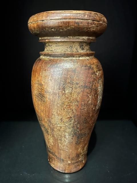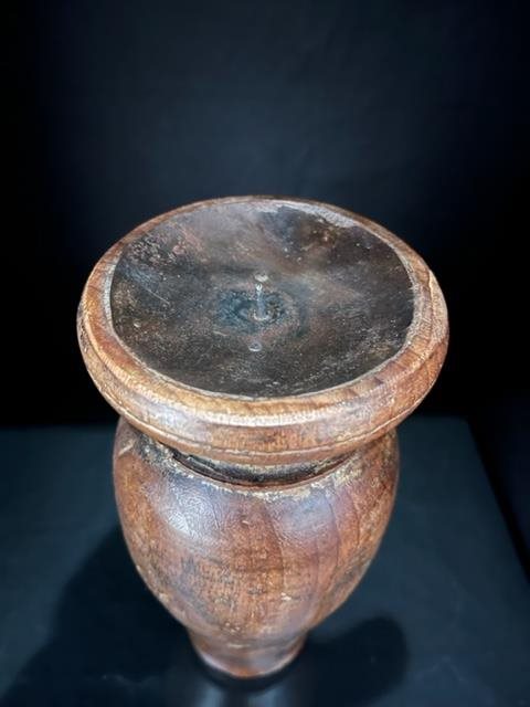 Lovely old turned wood candle holder with metal pricket to keep the candle in place.
