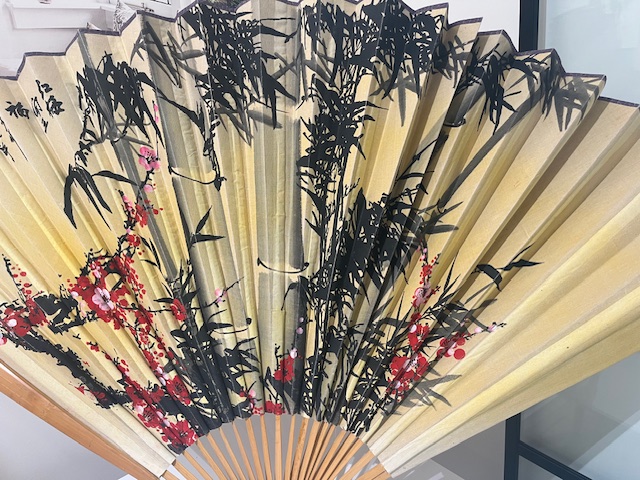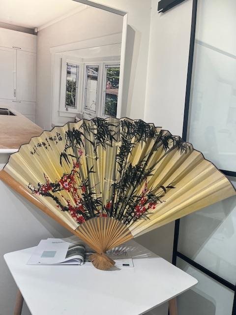 Very large bamboo and fabric hand painted fan. Would look magnificent as a wall hanging.