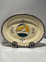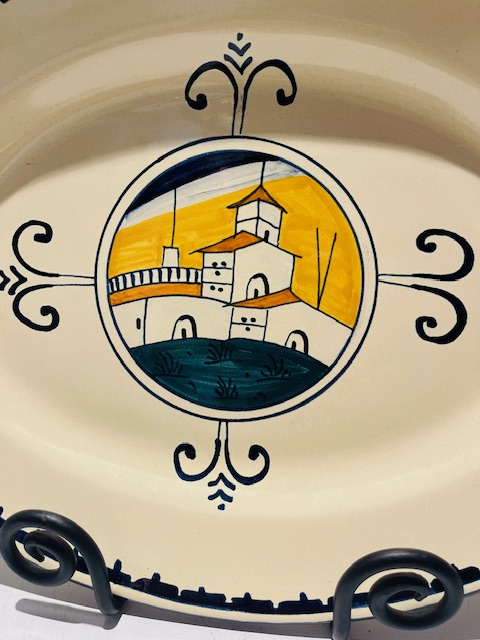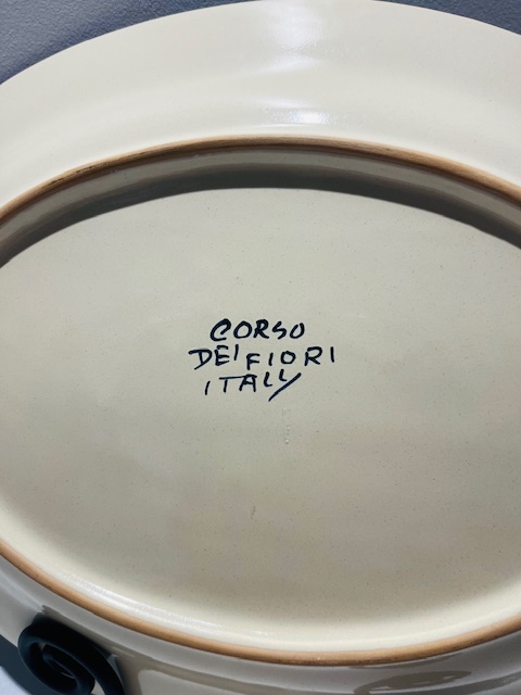 Italian ceramic serving platter by Corso dei Fiori, from the Casolare series. Hand painted in Italy, this oval platter features a charming coastal scene framed by decorative scrollwork on a soft cream ground. The hand written maker’s mark to the reverse confirms its workshop origin, with each piece individually finished rather than mass produced.
