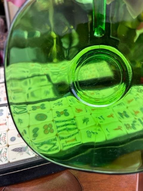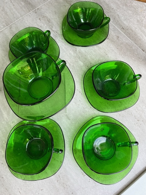 Set of 6 green glass tea cups and saucers from France.