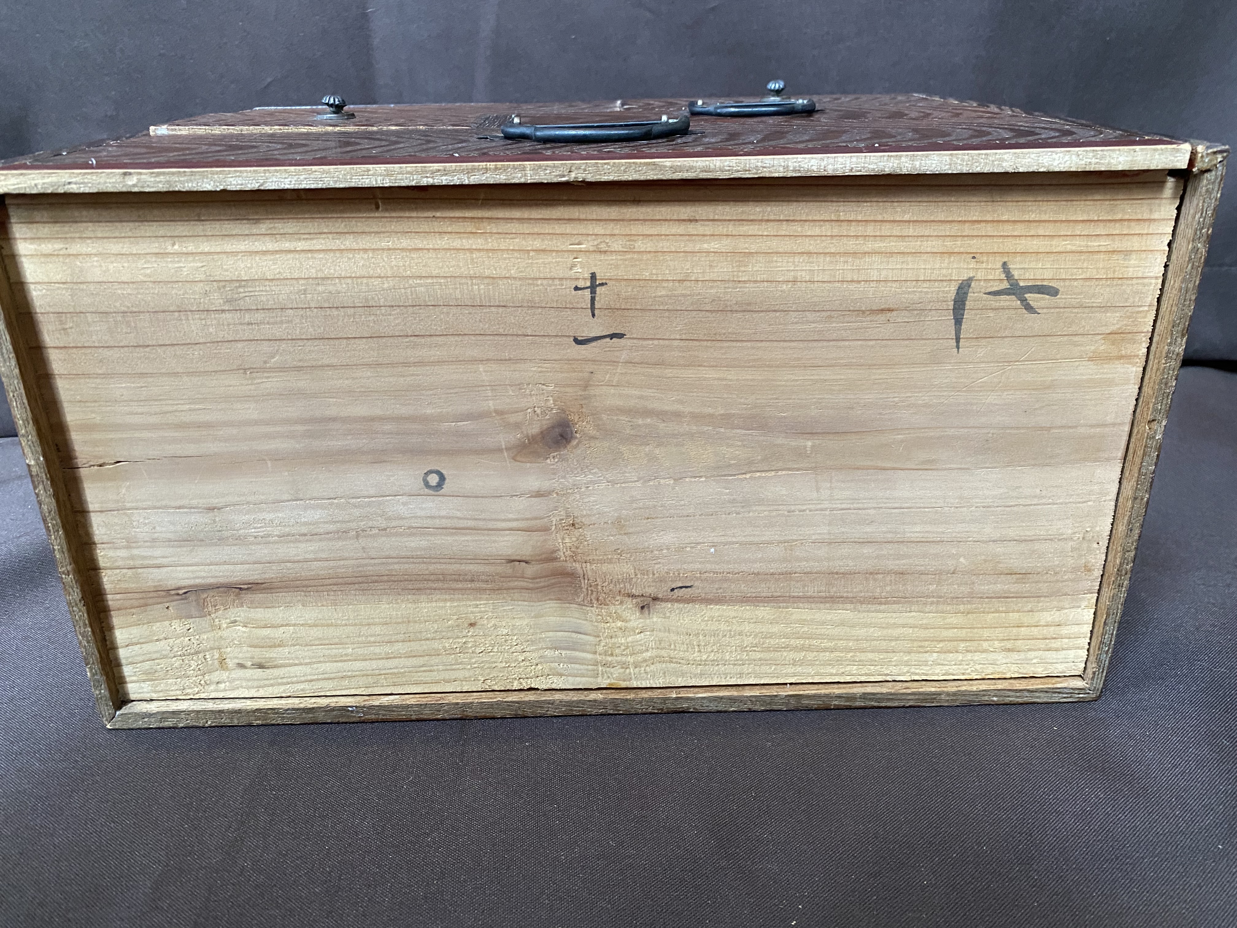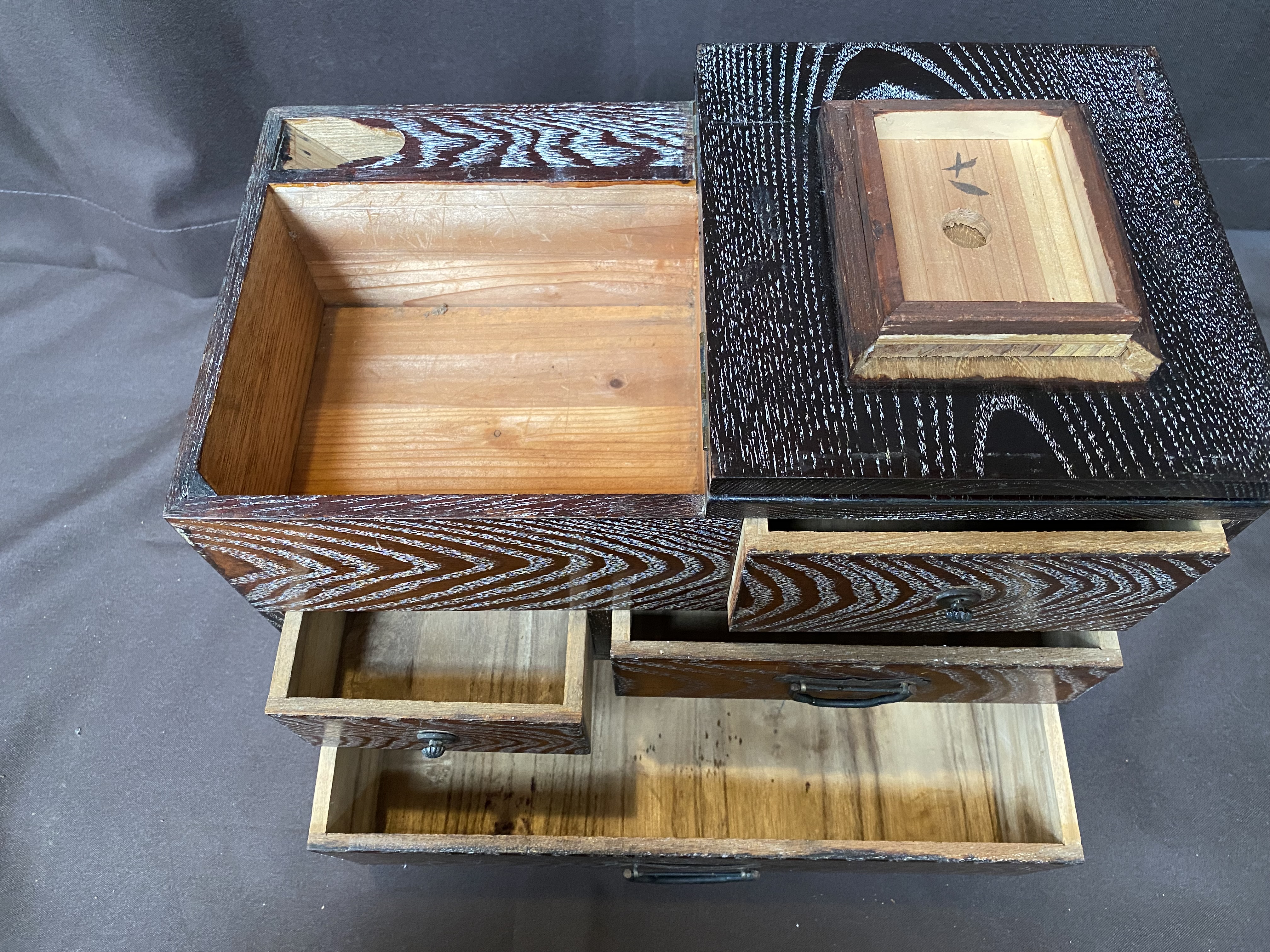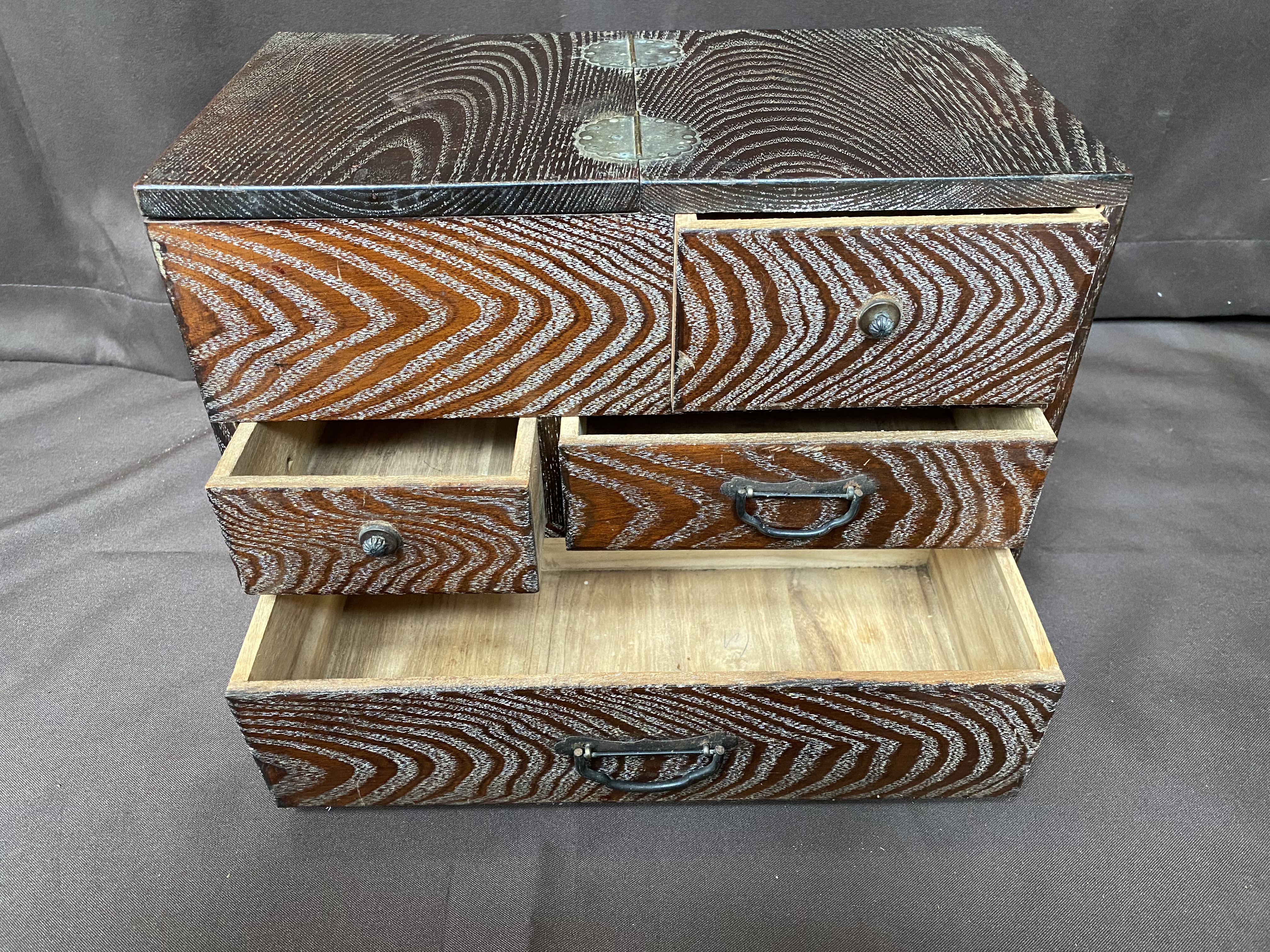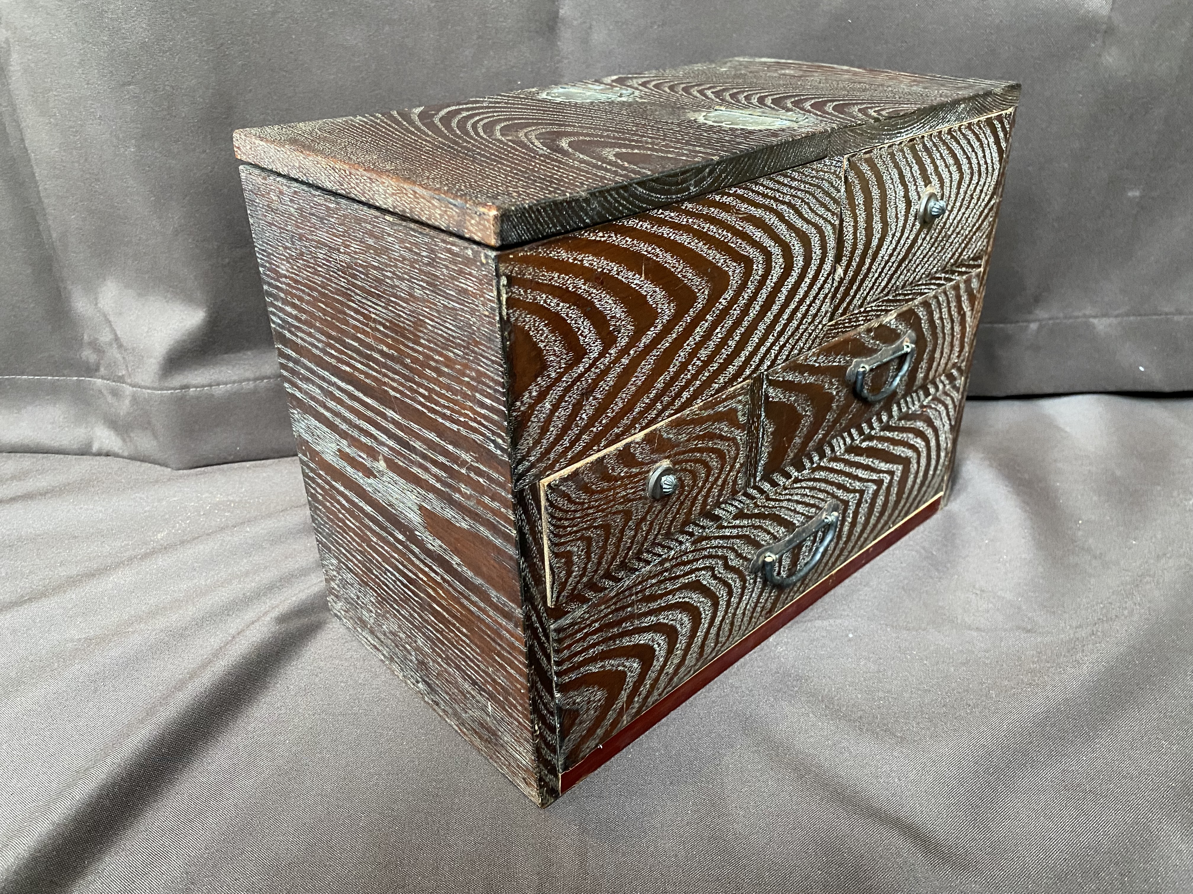 A Hari Bako (Pin Box) was made to organize all your sewing gear but are great as jewellery boxes or to organize any small items. They are also very decorative, this one with a very interesting wood grain. It has 4 drawers with cast iron handles. The top compartment has a hinged lid.