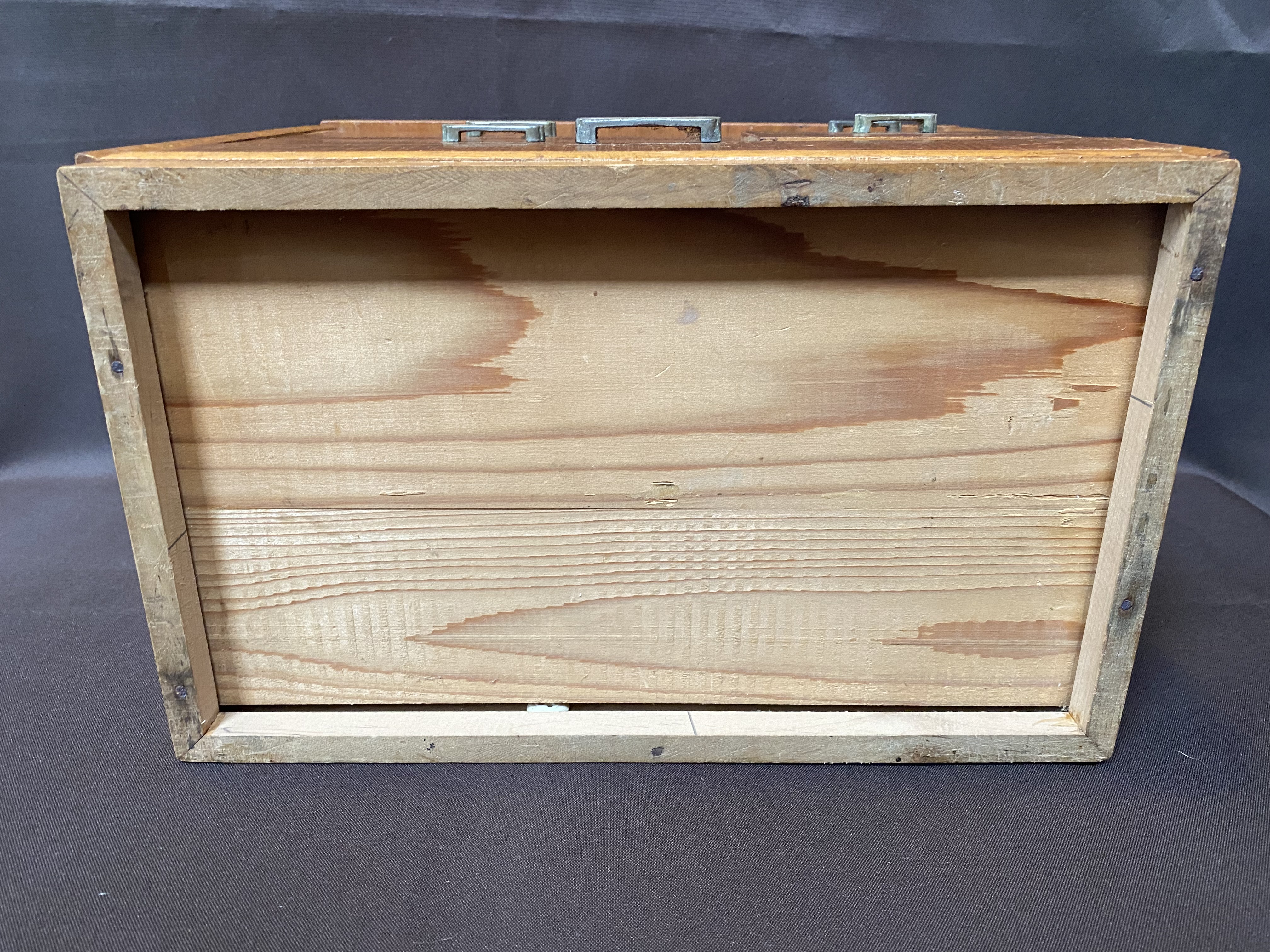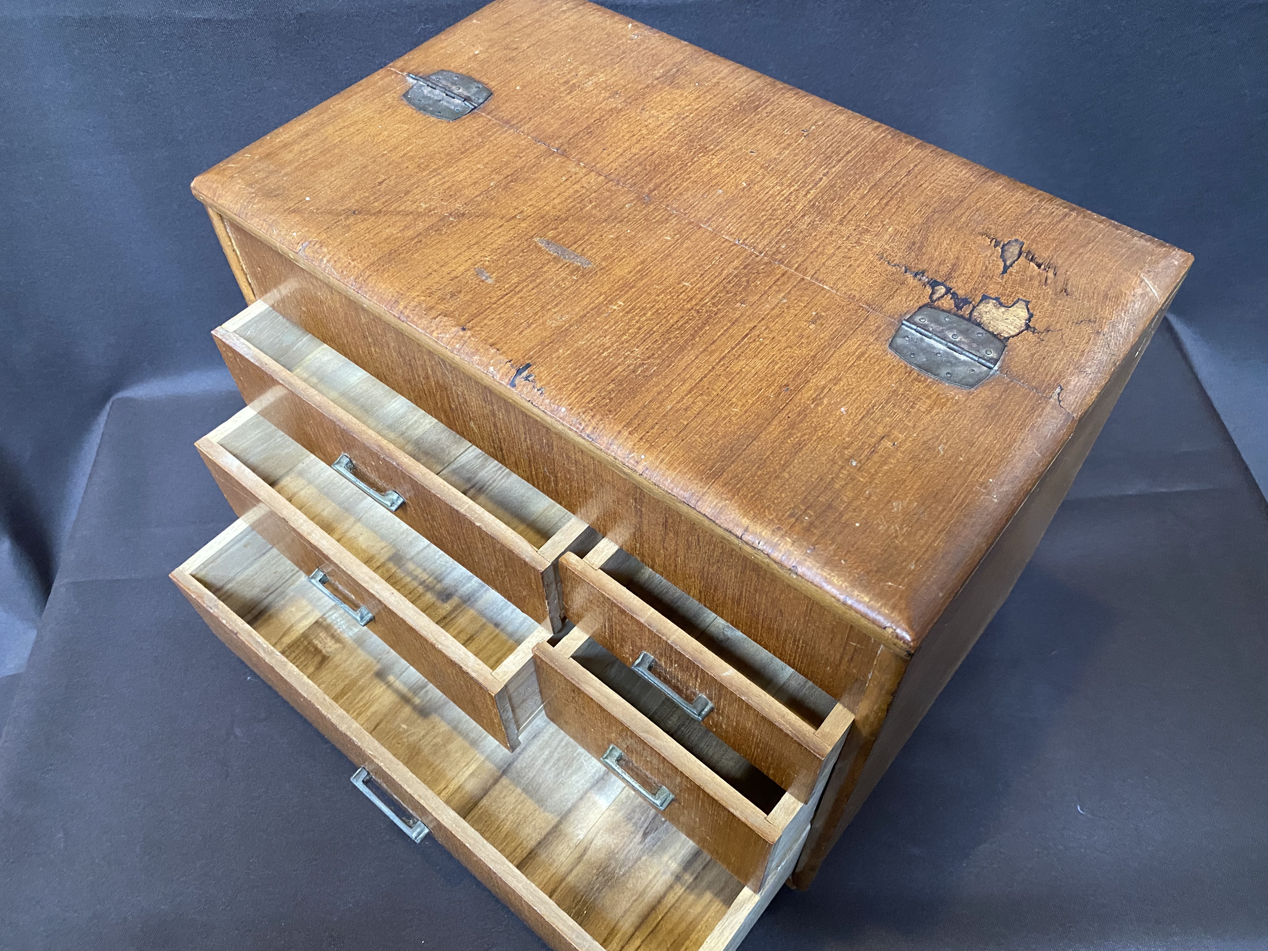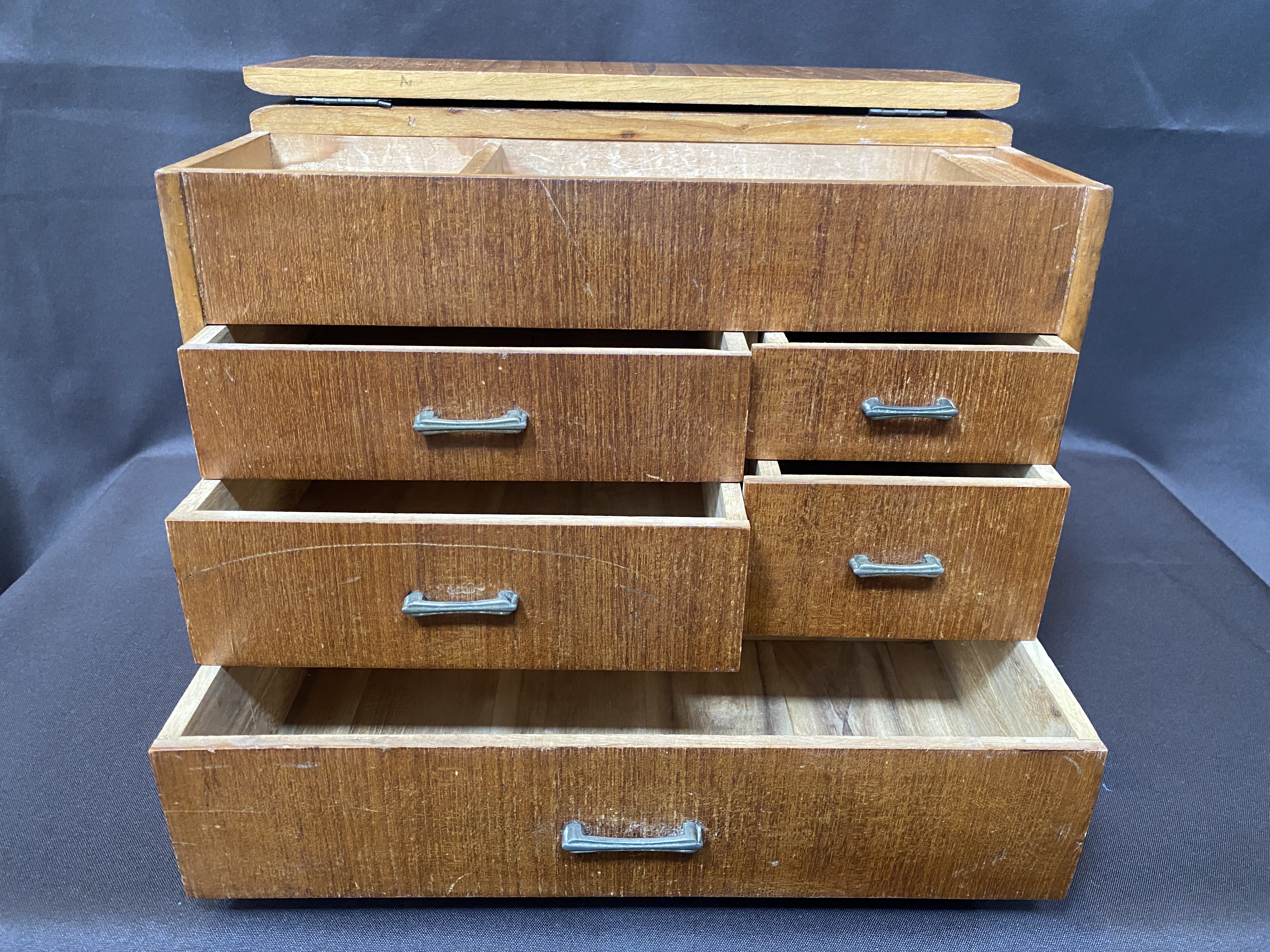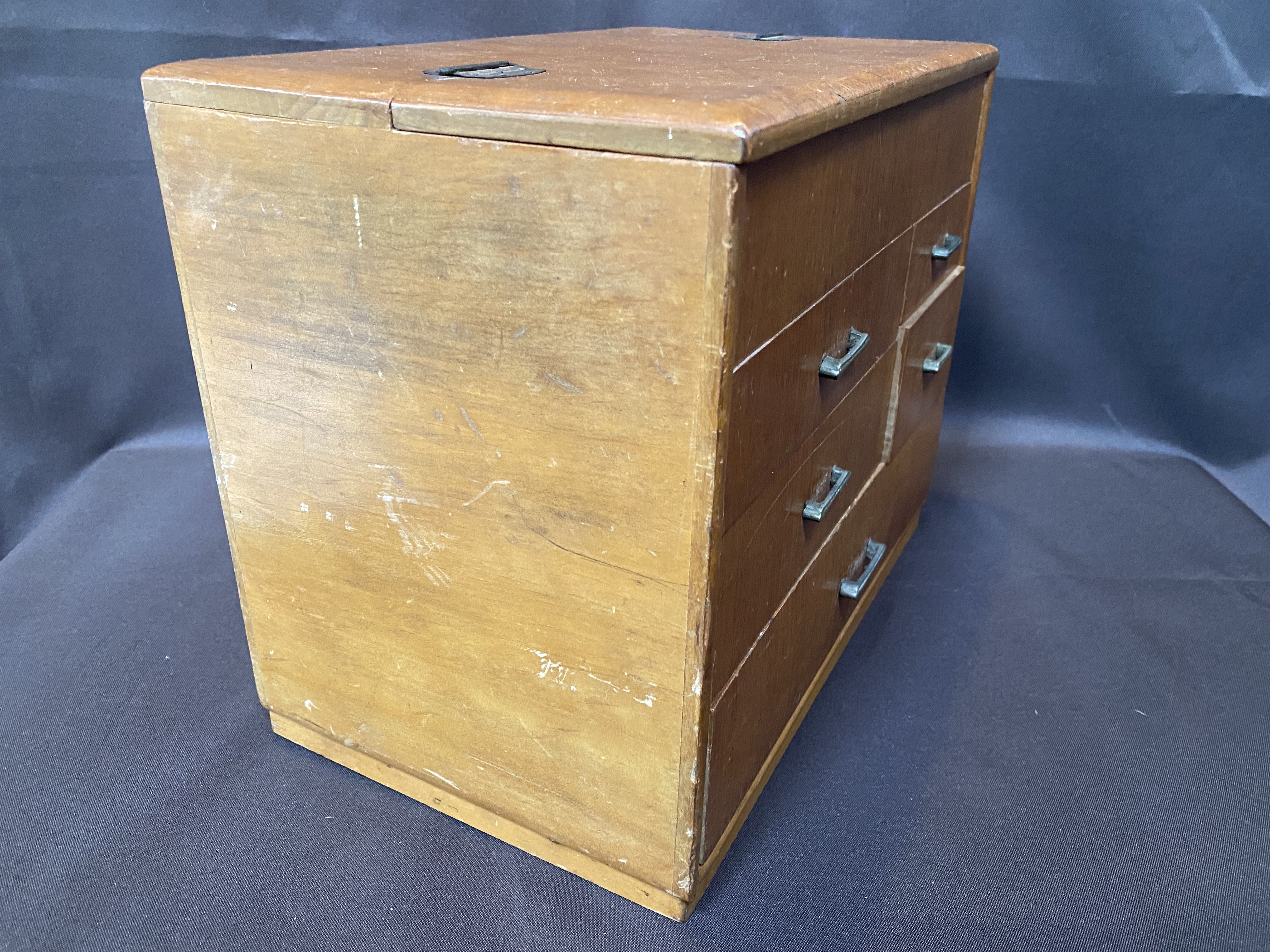 A Hari Bako (Pin Box) was made to organize all your sewing gear but are great as jewellery boxes or to organize any small items. They are also very decorative. This example has 5 drawers as well as the top lid with tray. There is also a secret compartment. Finished in light wooden veneer. There is a small section of veneer on the top that has some water damage but otherwise it is in very good condition considering its age.