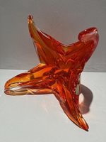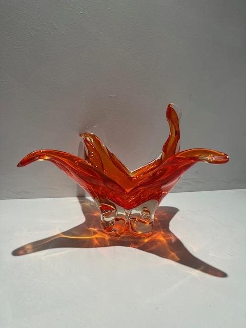 This Murano hand-blown glass bowl is sculpted in vivid shades of orange and amber with clear glass accents. It is a fine example of Mid-Century Murano art glass, where movement, light and fluidity are central to the design. The flared, organic form gives it a star-like or flower-like appearance, typical of the freeform sommerso and vetro artistico styles that emerged from Murano workshops in the 1950s and 60's