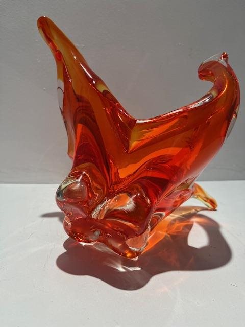 Murano glassmaking has its roots in the 13th century, when Venetian artisans were relocated to the island of Murano to protect the city from glass furnace fires and to keep their techniques secret. During the Mid-20th century, Murano studios such as Seguso, Barbini, and Fratelli Toso popularised these bold freeform designs using the sommerso technique (layering transparent coloured glass over clear). Pieces like this became icons of Italian modernism and remain highly collectable today.