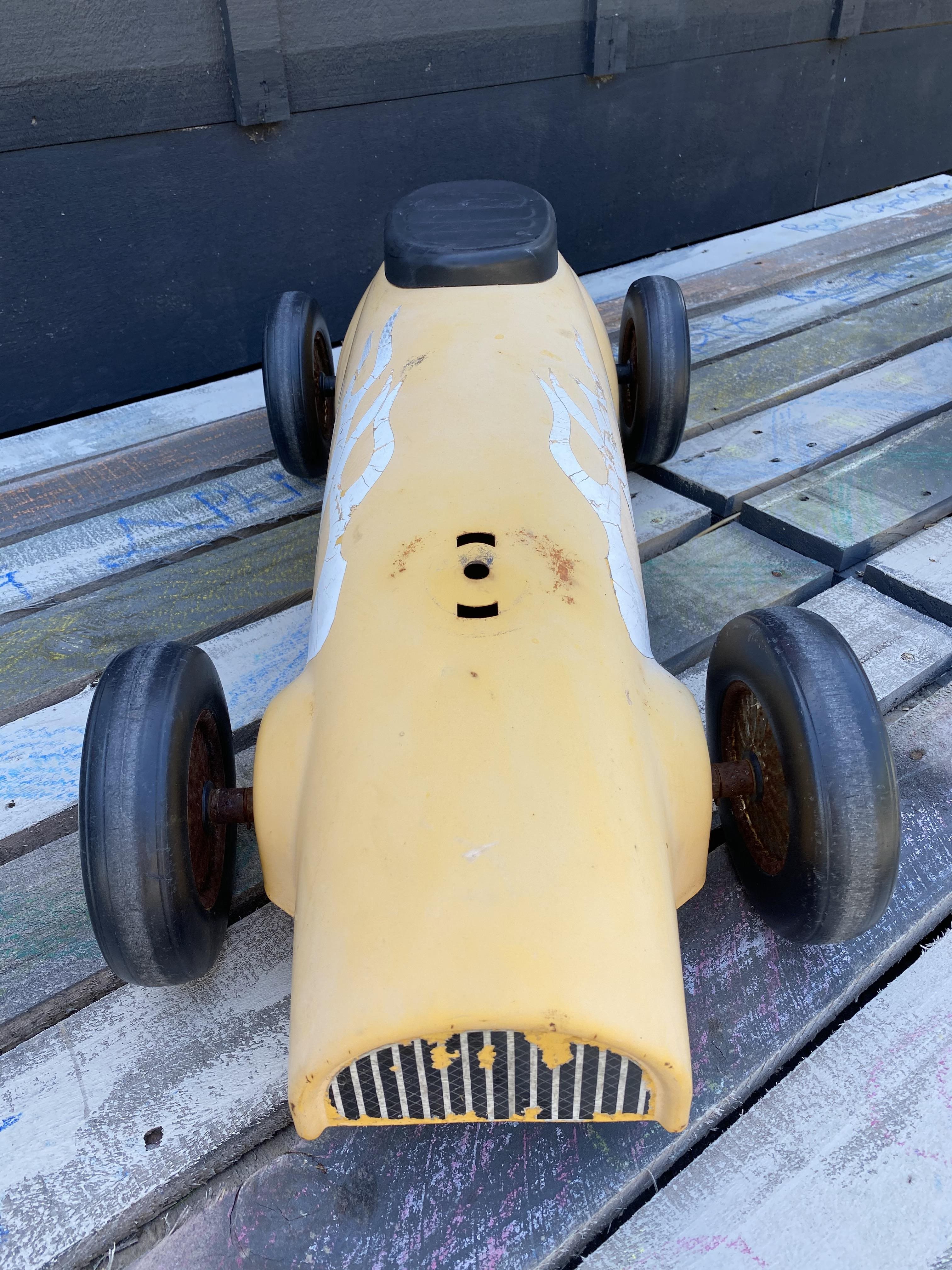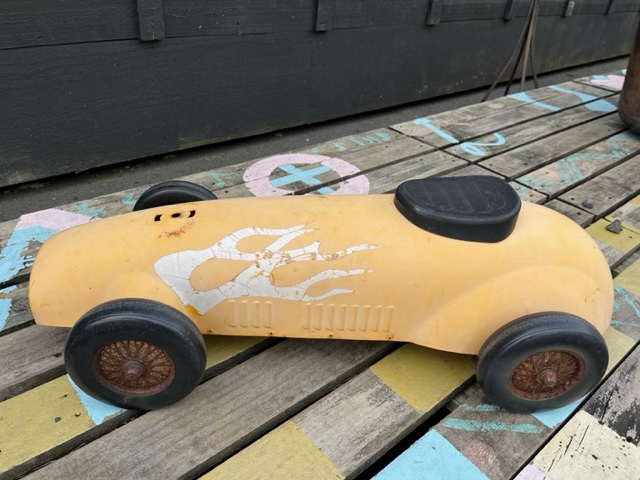 The paintwork is faded and the steering wheel is missing but this ride-on car has great style and would look fabulous on a high shelf or amongst other motoring or toy meomorabilia.