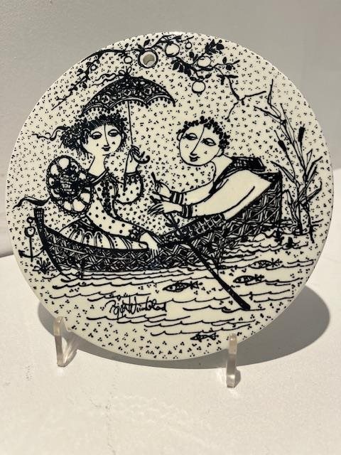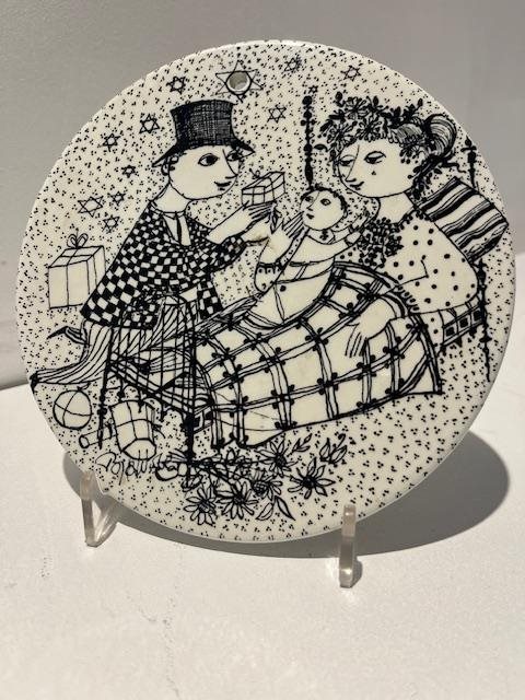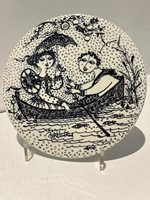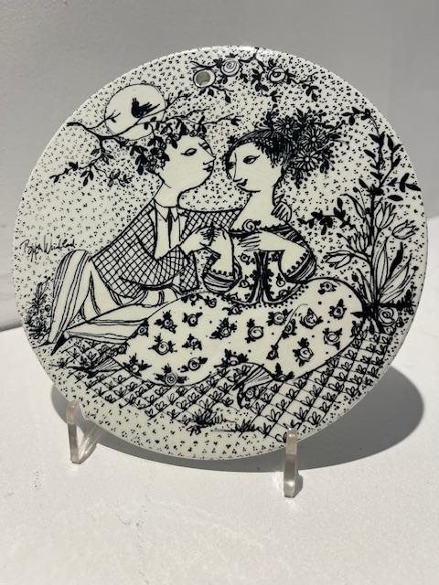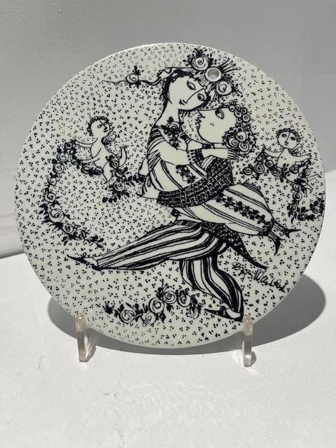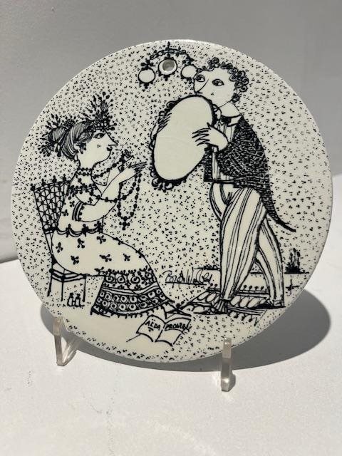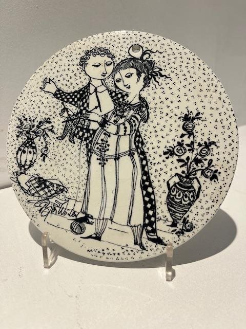 The series features intricate black and white illustrations with a Mid-Century Modern style. The twelve plates tell the story of a couple's relationship, from meeting in January to the arrival of a baby in December.
