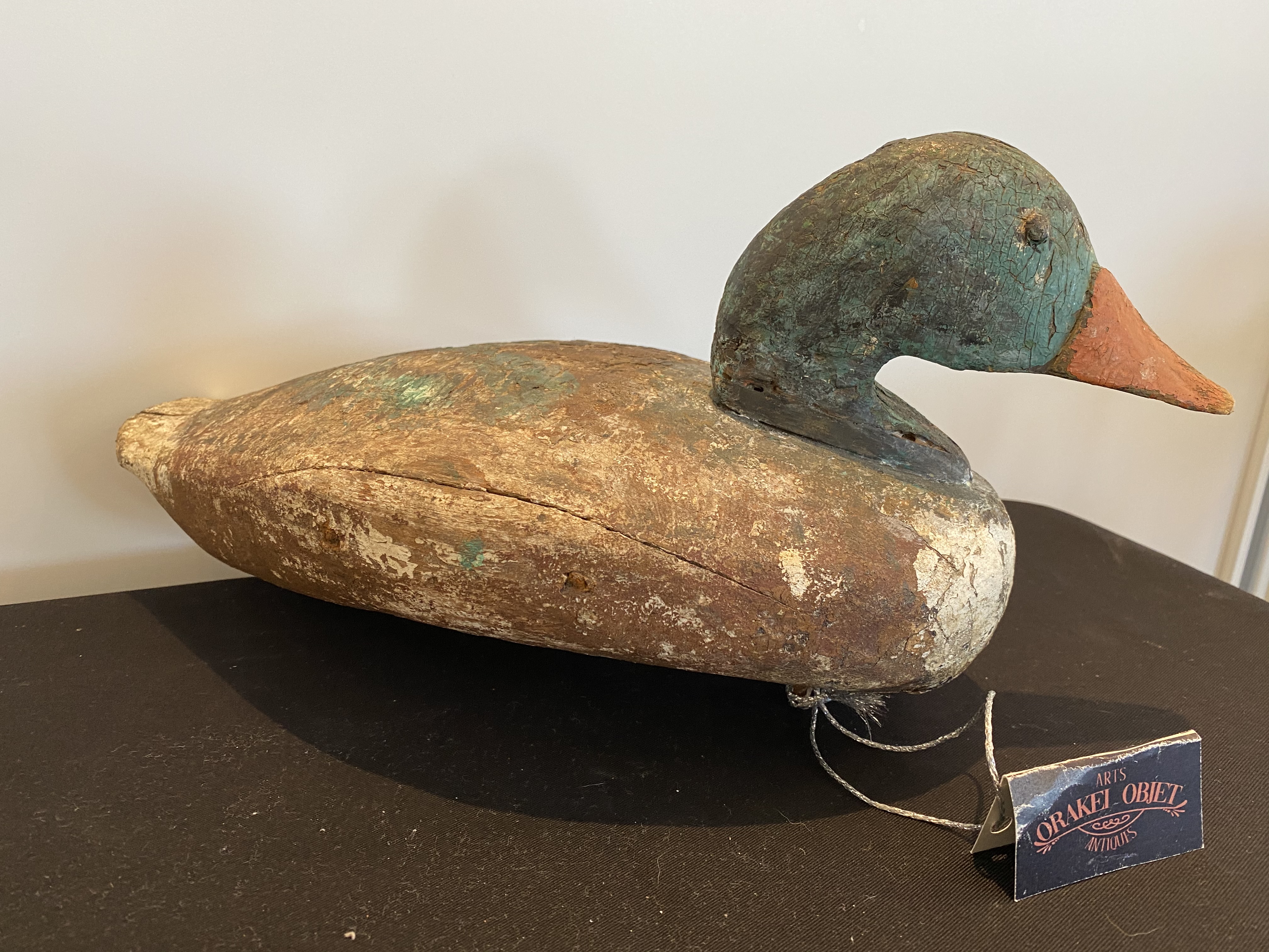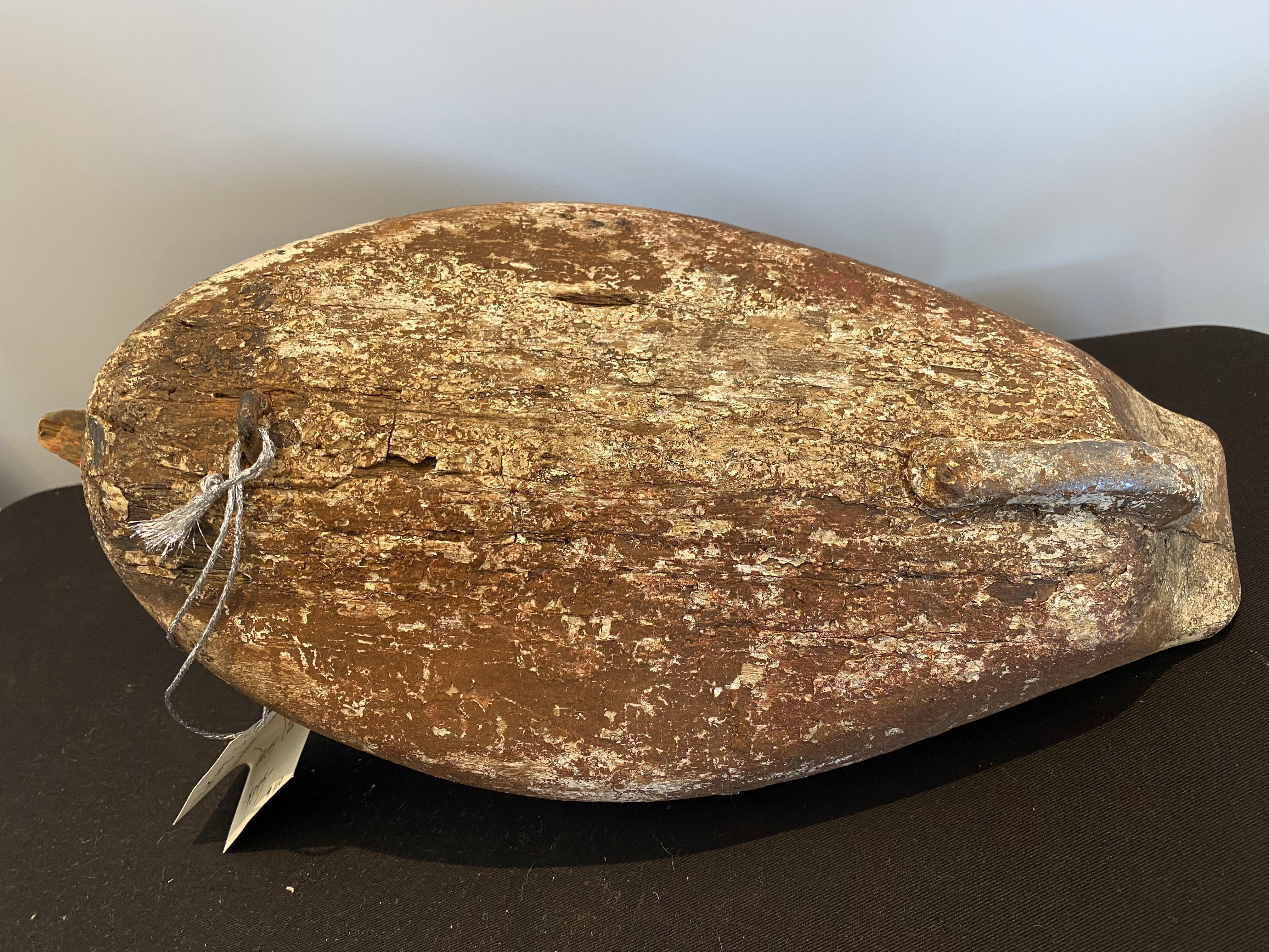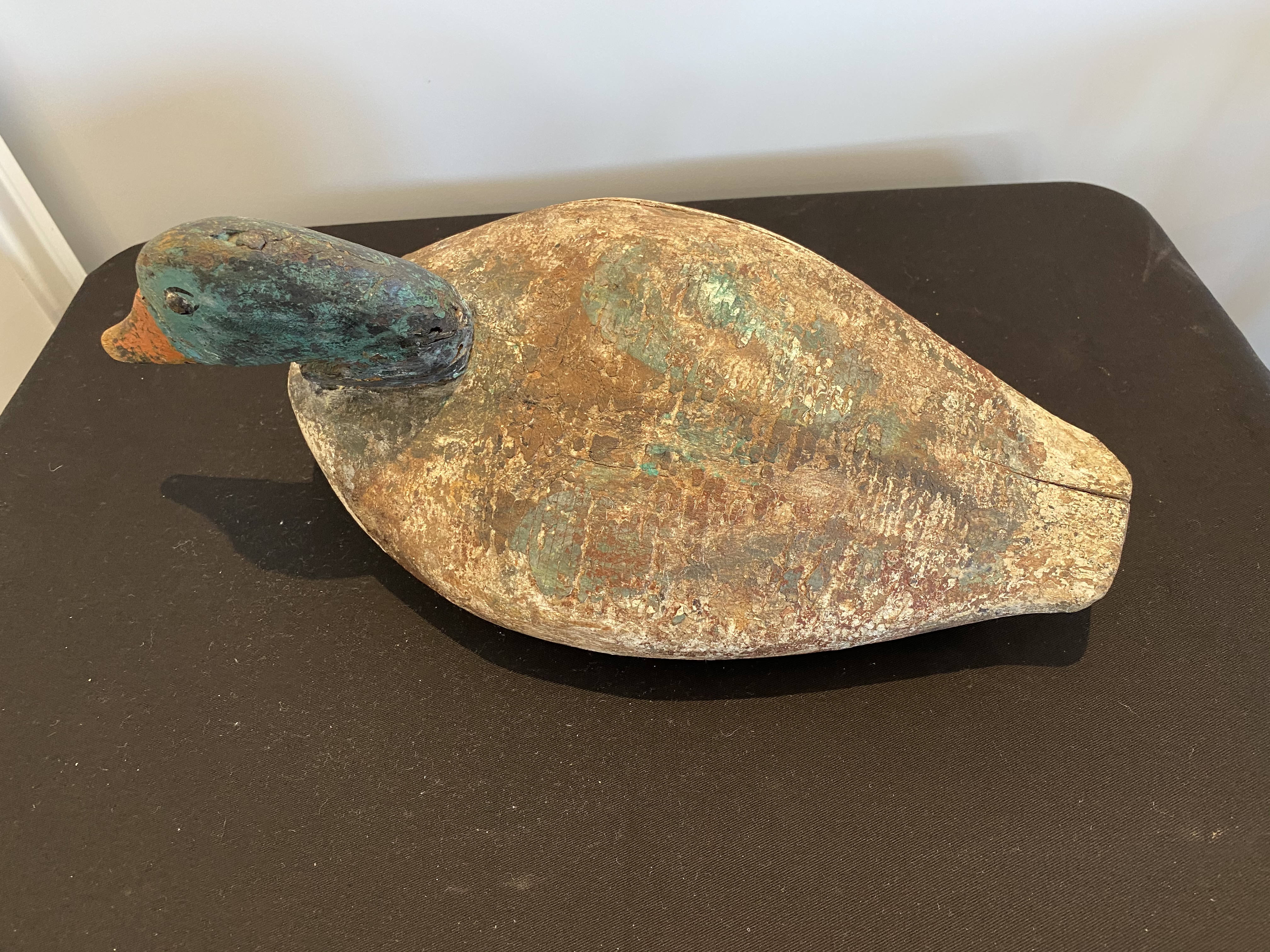 Old Wooden Decoy duck, probably dating from the mid-century.  It has seen some good use by a hunter judging by the worn and faded paint.