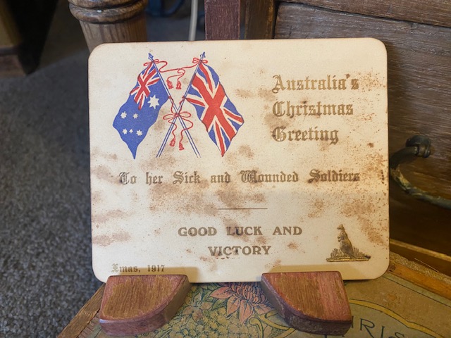 A separate card reads, " Australia's Christmas Greeting", "To our Sick and Wounded Soldiers", "Good Luck and Victory, Xmas 1917"
