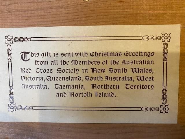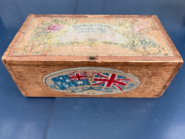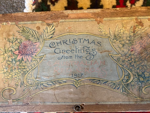 I imagine there won't be many of these surviving since they were sent to the wounded soldiers in far away hospitals over 100 years ago. Lid reads, "Christmas Greetings from the Australian Red Cross, 1917". Beneath the lid it reads " This gift is sent with Christmas Greetings from all the Members of the Australian Red Cross Society in New South Wales, Victoria, Queensland, South Australia, West Australia, Tasmania, Northern Territory and Norfolk Island.