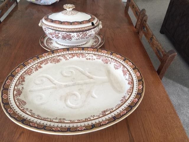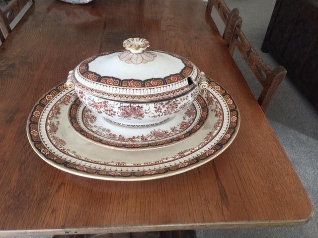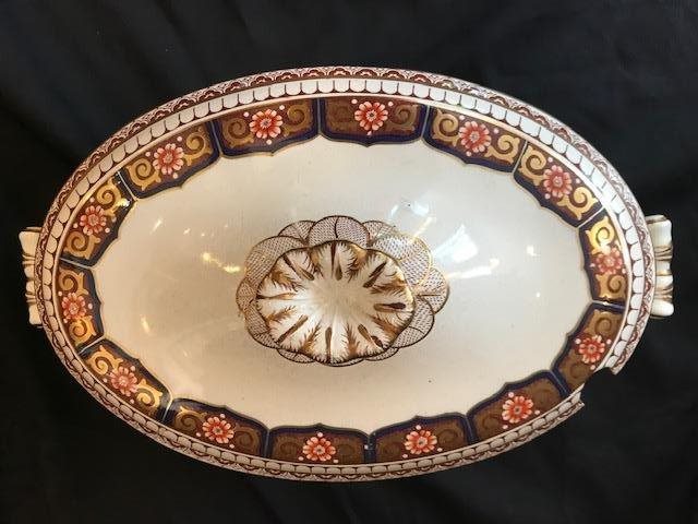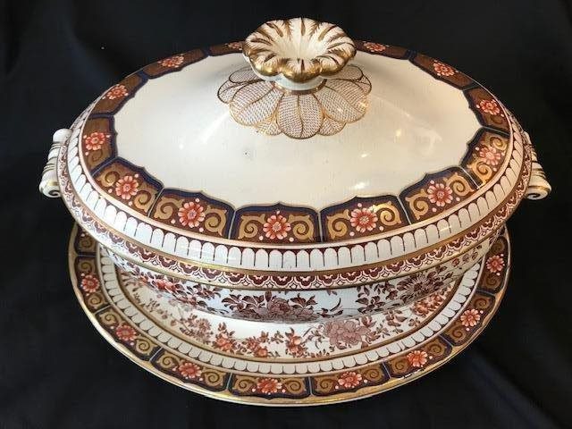 Wedgwood Bone China Imari Mandalay pattern Lidded Soup Tureen with Underplate. Also a large and imposing Meat Platter of the same series. Both Circa 1884. Lidded soup tureen is decorated with Prince of Wales feathers motif.