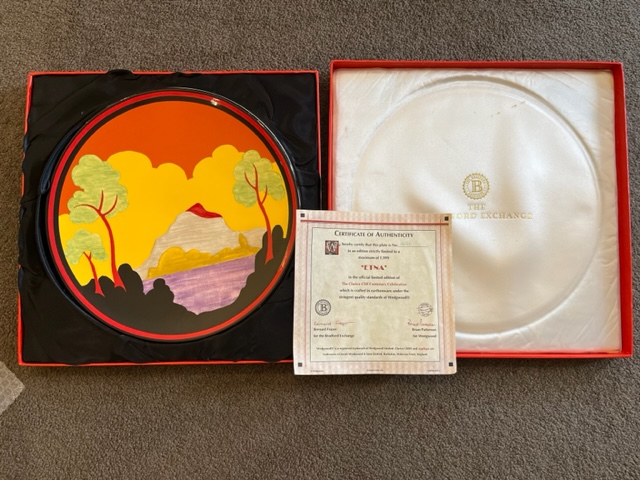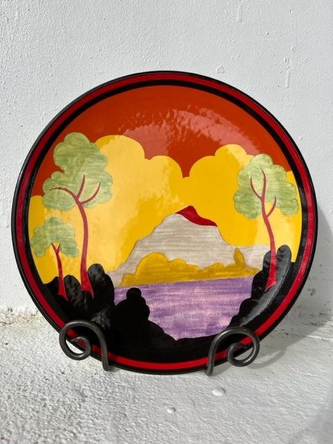 This is a stunning Wedgwood reproduction of the iconic Clarice Cliff Etna Plate, (showing a stylized Mt Etna).
