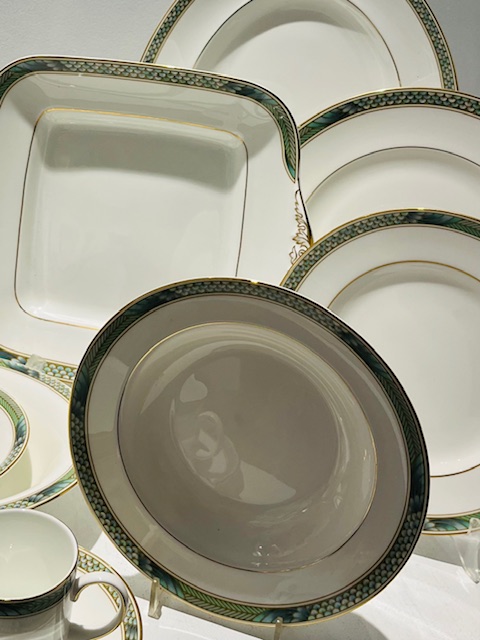 An elegant English bone china dinner service in Wedgwood’s “Icarus” pattern, introduced in 1992. Featuring teal and emerald feather motifs with fine gilded banding on a classic ivory ground, this design blends classical inspiration with late 20th-century refinement.